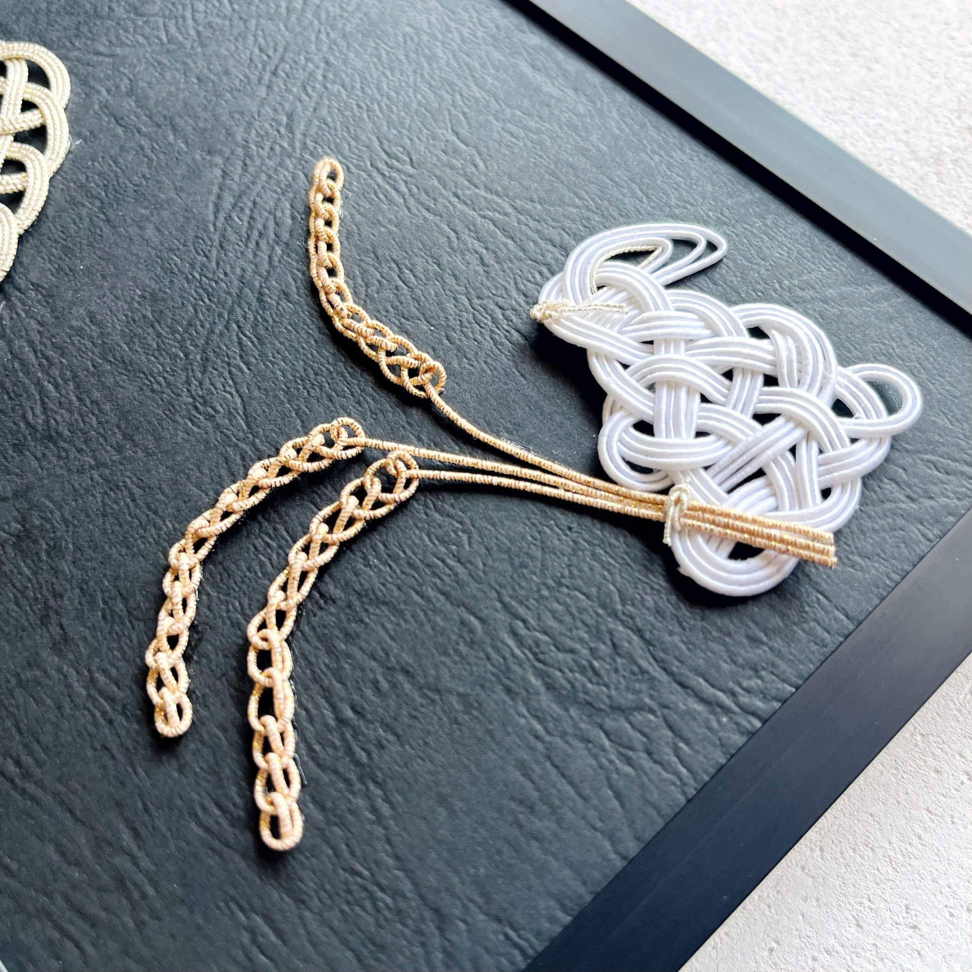 The rice stalks are created with Hana knots and Oikake knots, continuous patterns that carry the wish for abundance and prosperity.